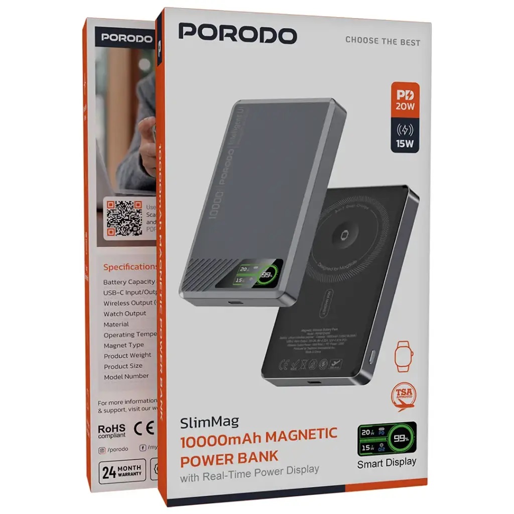 پاوربانک باریک با نمایشگر پرودو 10K porodo-slimmag-10000mah-magnetic-power-bank-pdpbfch095
