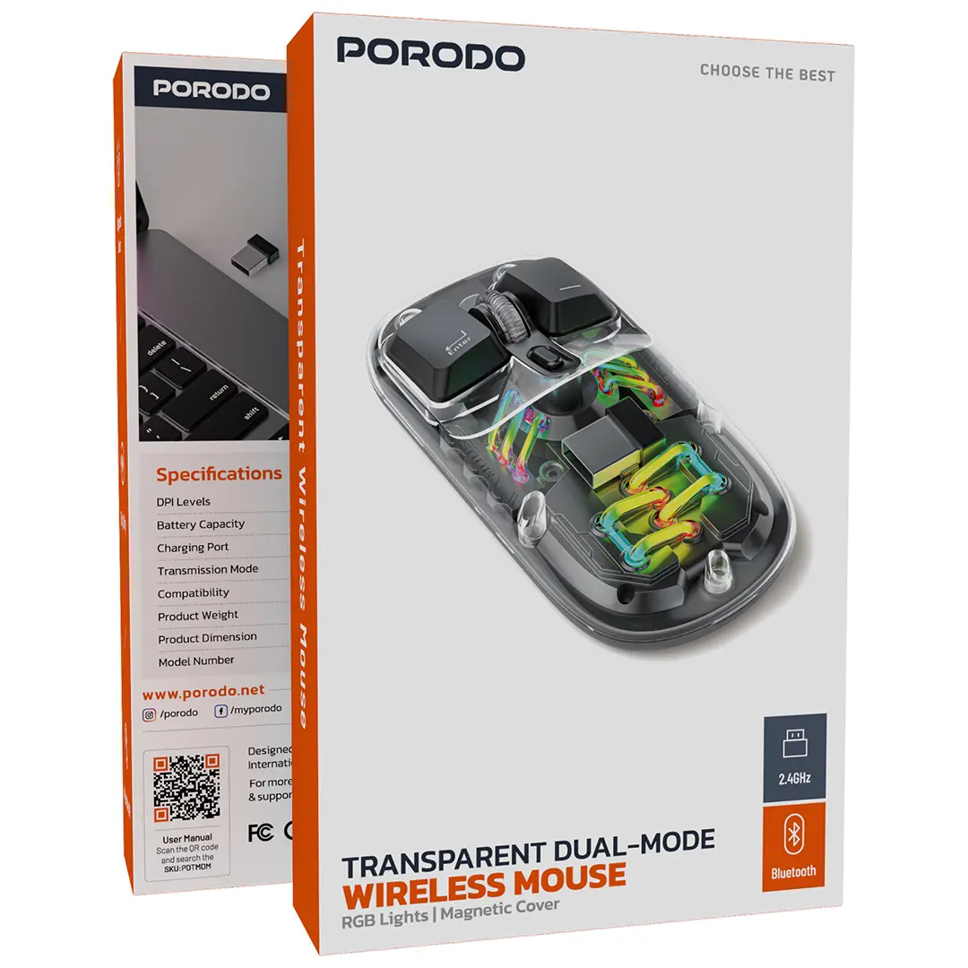 شرکت Porodo ماوس بی‌سیم دو حالته شفاف را ارائه می‌دهد، دستگاهی عالی برای به حداکثر رساندن زیبایی و راحتی لپ‌تاپ یا کامپیوتر شما. این ماوس دارای ظرفیت باتری ۴۰۰ میلی‌آمپر ساعت، نور RGB و DPI قابل تنظیم (۸۰۰، ۱۲۰۰، ۱۶۰۰) است. می‌توانید به سادگی از طریق بلوتوث یا حالت بی‌سیم متصل شوید و آن را از طریق پورت Type-C شارژ کنید. علاوه بر این، با ویندوز، مک، اندروید و iOS سازگار است.