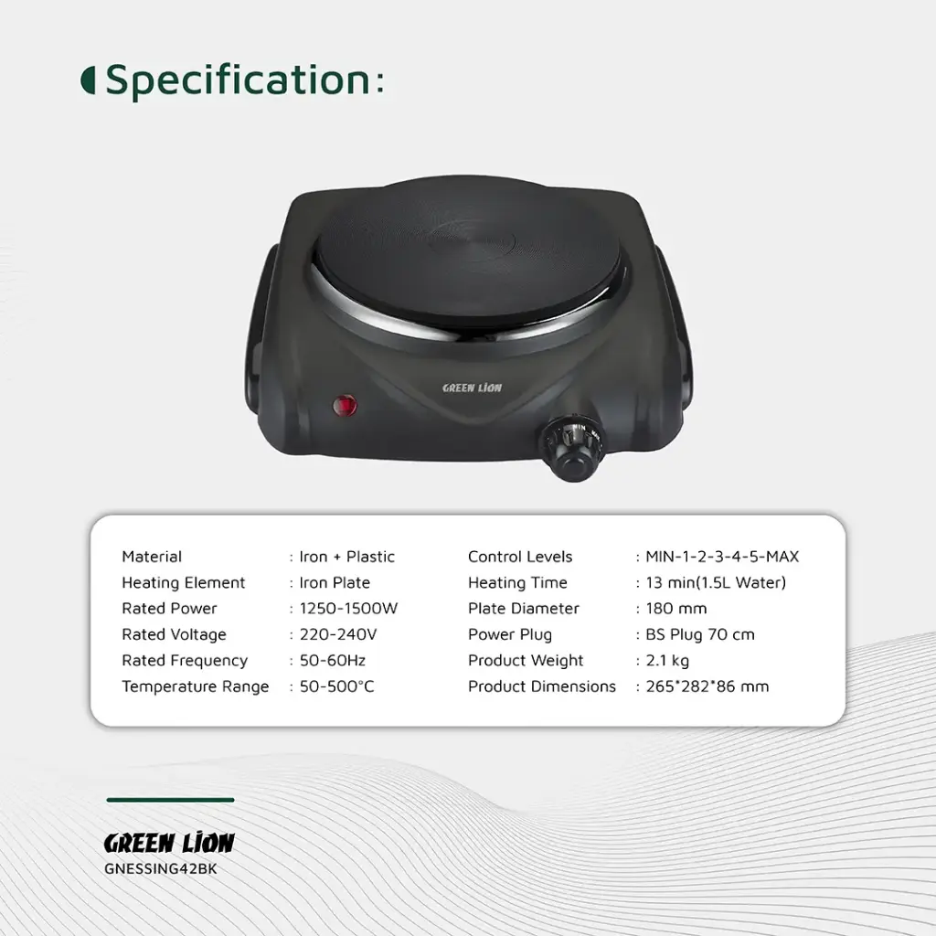 اجاق گاز برقی تک شعله گرین لاین، یک وسیله عالی برای هر کسی است که به دنبال یک اجاق گاز همه کاره است. این اجاق گاز از جنس ترکیبی آهن و پلاستیک ساخته شده و میتواند از ۲۲۰ تا ۲۴۰ ولت کار کند و دارای یک المنت گرمایشی صفحه آهنی با قدرت کامل بین ۱۲۵۰ تا ۱۵۰۰ وات است. این اجاق گاز میتواند در هر دمایی از ۵۰ تا ۵۰۰ درجه سانتیگراد کار کند و به دلیل ۵ مرحله تنظیم (حداقل-۱-۲-۳-۴-۵-حداکثر) کنترل دقیقی را ارائه میدهد. این اجاق گاز میتواند ۱.۵ لیتر آب را در ۱۳ دقیقه بجوشاند که برای مواقع عجله عالی است. قطر صفحه ۱۸۰ میلیمتری و دوشاخه BS با سیم ۷۰ سانتیمتری از ویژگیهای مناسب هستند و پایه ضد لغزش، دستگاه را در حین استفاده محکم در جای خود نگه میدارد. گرین لاین، نگهداری اجاق گاز برقی را به طرز شگفتانگیزی خوب انجام میدهد و با توجه به کارایی پخت و پز و سهولت تمیز کردن، یک وسیله ارزشمند برای آشپزخانه است. سیستم خاموش کردن ایمنی داخلی، نشانگر قدرت و کنترل ترموستات وجود دارد که کار با این اجاق گاز را بدون نگرانی میکند.