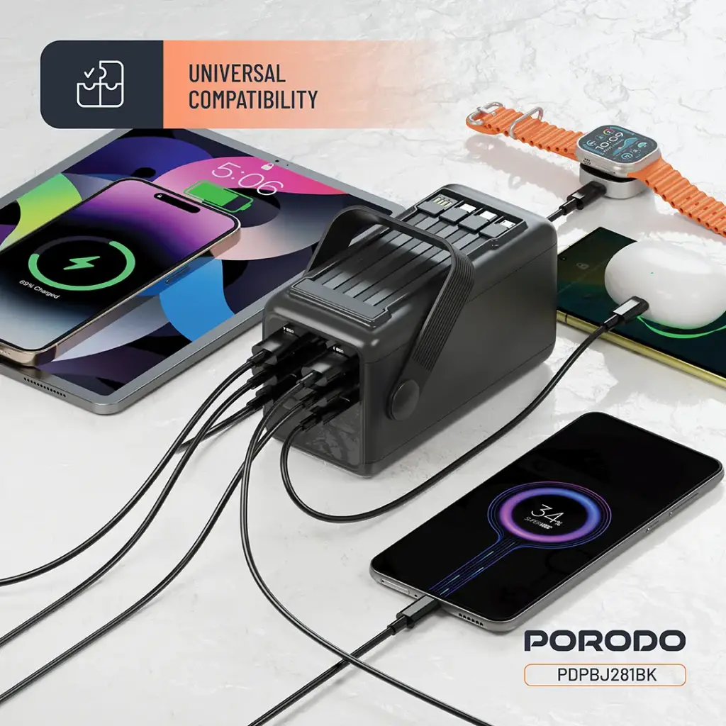 پاوربانک Porodo Lara 50000mAh با کابلهای یکپارچه و چراغ قوه - مشکی، قدرتمندترین راه حل برای همه گجتهای شماست. این پاوربانک با ظرفیت باتری غولپیکر 50000 میلیآمپرساعت، قدرتی را ارائه میدهد که برای مدت طولانی دوام میآورد و در نتیجه تضمین میکند که دستگاههای شما حتی در دورافتادهترین مکانها شارژ میشوند. این پاوربانک انواع خروجیهای USB-C، USB-A، میکرو و لایتنینگ را ارائه میدهد - که تنها چند مورد از آنها هستند - و آن را قادر میسازد تا تلفنها، تبلتها و سایر لوازم الکترونیکی را به طور همزمان شارژ کند. با شارژ سریع PD، میتواند دستگاهها را به سرعت شارژ کند و در نتیجه زمان انتظار را کاهش دهد و شما را در حرکت نگه دارد. چراغ قوه داخلی یکی دیگر از مزایای پاوربانک است و همچنین طراحی دستی آن، به این معنی است که میتوانید آن را به راحتی در هر مکانی حمل کنید. کابلهای یکپارچه همچنین به این معنی است که دیگر نیازی به جستجوی سیمهای اضافی نخواهید داشت. ایمنی در این دستگاه در نظر گرفته شده است و در نتیجه، گجتهای شما هنگام شارژ ایمن خواهند بود. این پاوربانک یک همراه عالی برای سفرها، فعالیتهای خارج از منزل یا حتی استفاده روزانه است.